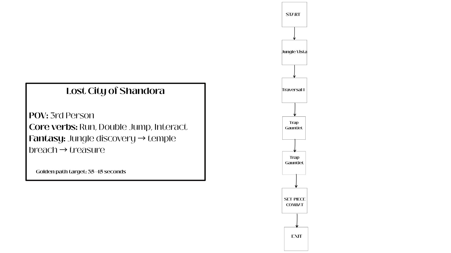 Shandora is an exploration-driven level set within ancient ruins reclaimed by nature. The level focuses on guiding the player through a layered environment using spatial design, lighting, and environmental cues.